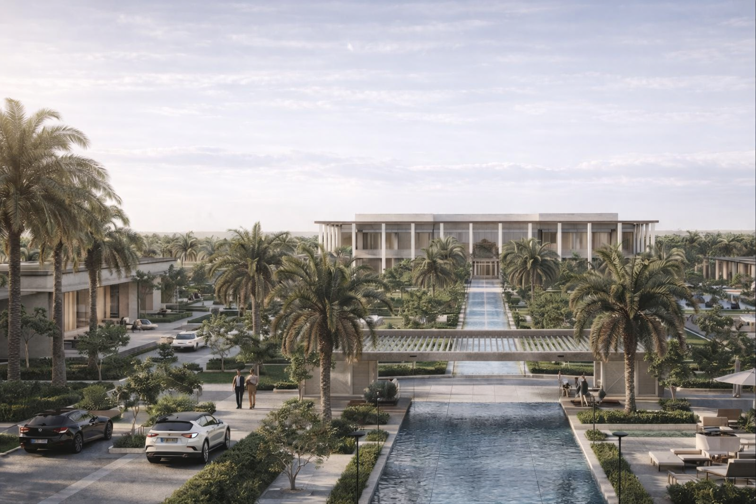 The contemporary architectural design features a central visual axis and a beautiful element: a green plaza with trees and palms that create a sense of tranquility and sophistication. The project perfectly balances beauty and functionality through its architectural masses, comprehensive facades, and intelligent circulation design, providing a vibrant and sustainable environment for cultural, administrative, and hospitality services.